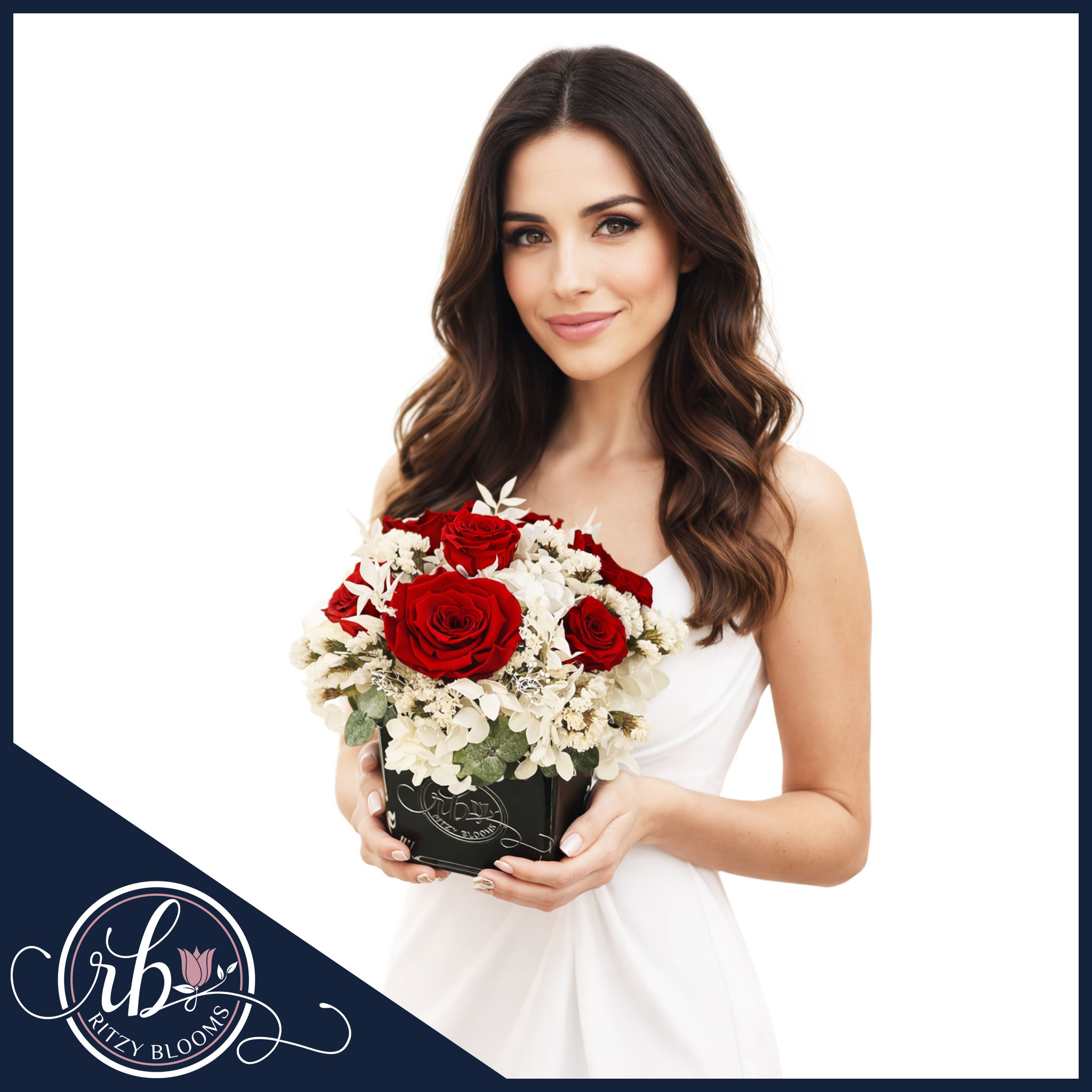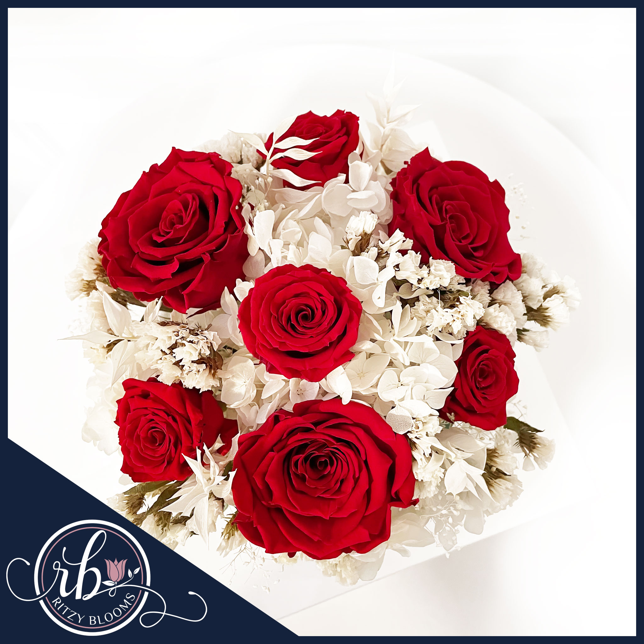 Handcrafted in our Fort Lauderdale studio and presented in a sleek black glass cube engraved with the Ritzy Blooms logo, it delivers a timeless, romantic sentiment that never fades.