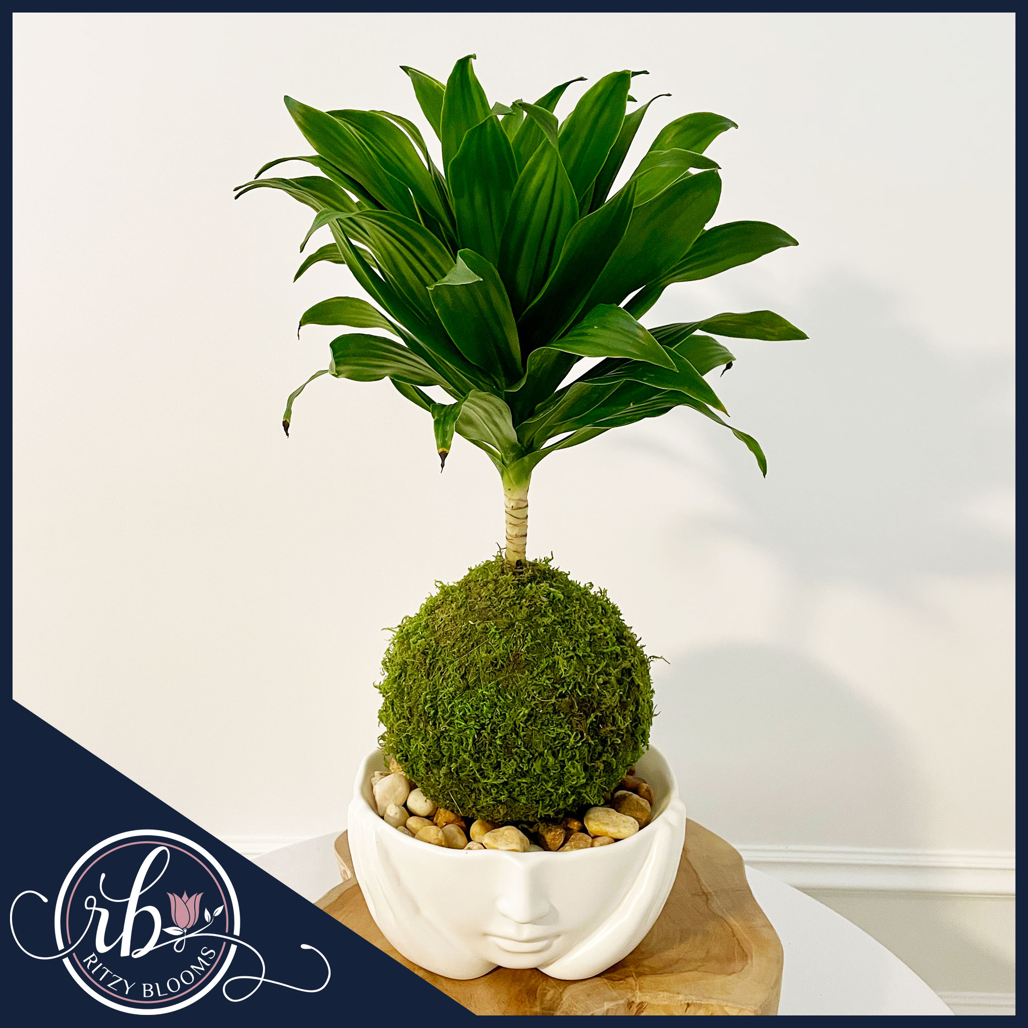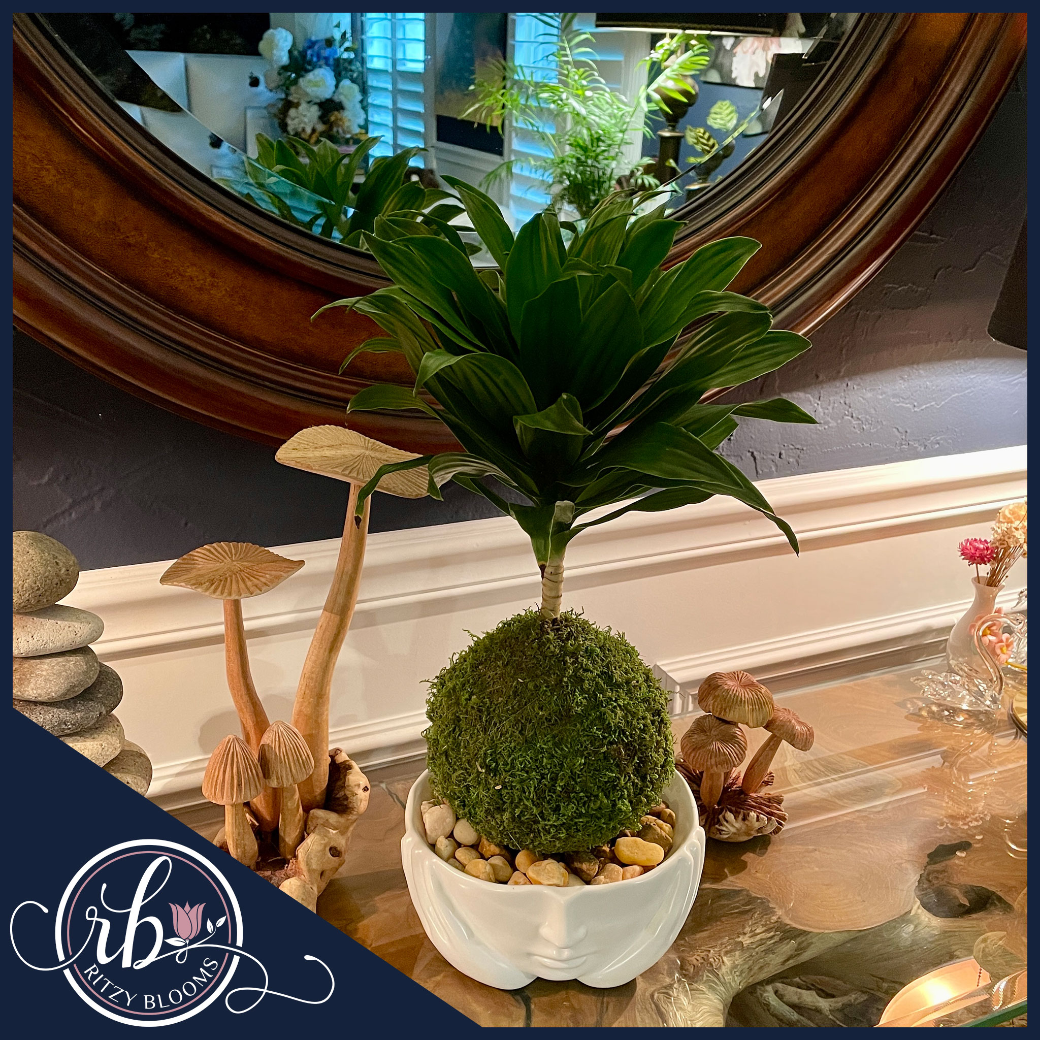 Each kokedama is carefully crafted by Ritzy Blooms in Fort Lauderdale, using premium sphagnum moss and secured with strong, discreet thread for a clean and natural finish. Displayed in a modern ceramic face vase with pebble accents, it’s ready to be showcased as a statement piece on any table, desk, or shelf.