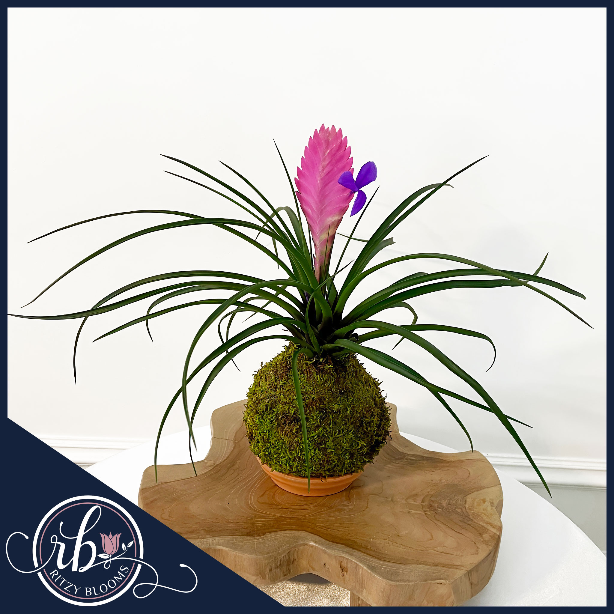 Add a touch of tropical beauty to your home or office with our Tillandsia cyanea kokedama, also known as the Pink Quill plant. This handcrafted kokedama features a bright pink bract, a delicate purple bloom, and long, arching leaves, all wrapped in natural green moss. Each piece is made in Fort Lauderdale by Ritzy Blooms and comes displayed on a simple clay saucer for a clean and natural presentation.